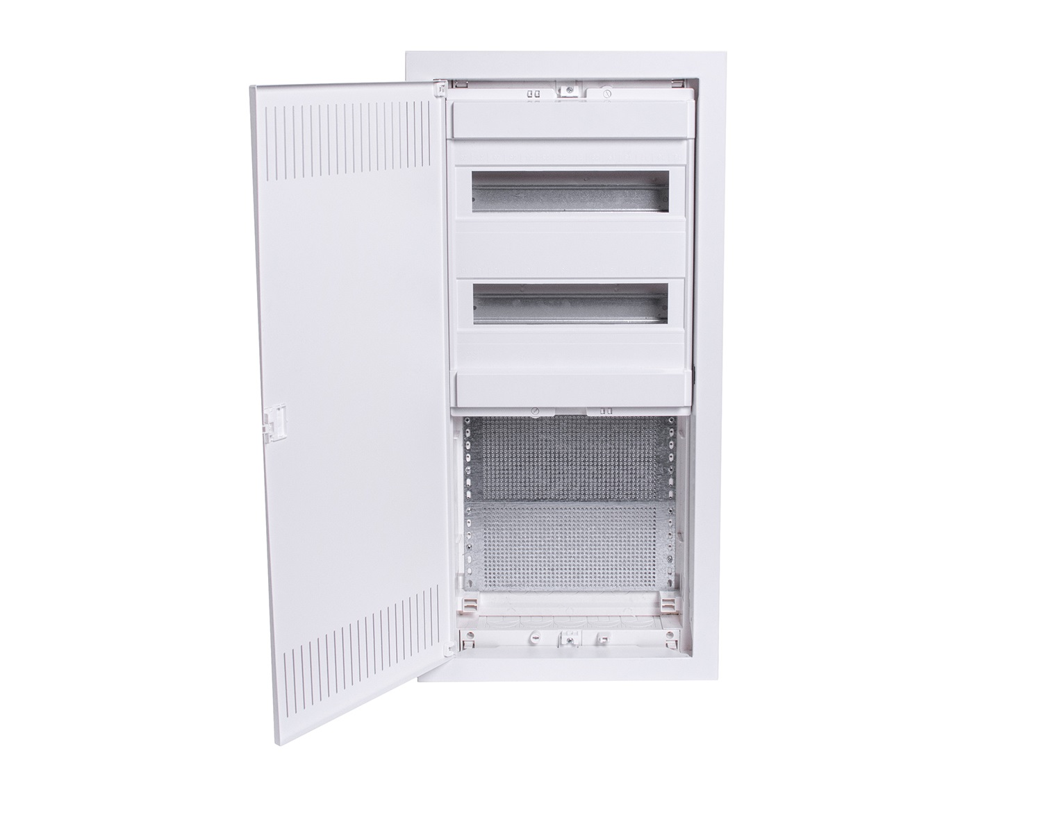 Descriere: Cofretele PMF-C sunt destinate in principal aplicatiilor rezidentiale. Combina dispozitivele energetic (modulare) si cele de IT , cu posibilitatea ca toate sa fie plasate intr-un singur cofret. Aceasta solutie salveaza spatiu si contribuie la un confort mai mare din partea beneficiarului. Designul lor este potrivit pentru montarea incastrata. Sistem dublu de fixare pentru peretii cu imperfectiuni. Testat cu fir incins la 850°C. Ajustarea pe inaltime a cadrului metalic permite compensarea imperfectiunilor peretelui. Cofretele sunt disponibile in versiuni de la 1 pana la 4 placi de montaj si pana la 3 sine DIN. Grad de protectie IP30, grad de protectie mecanic IK06. In livrarea standard se considera carcasa, usa metalica perforata, placi de montaj, șine DIN, partitie fara priza, materiale si instructiuni de montare. Culoare: alb RAL 9016